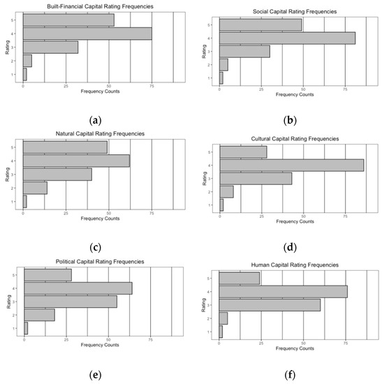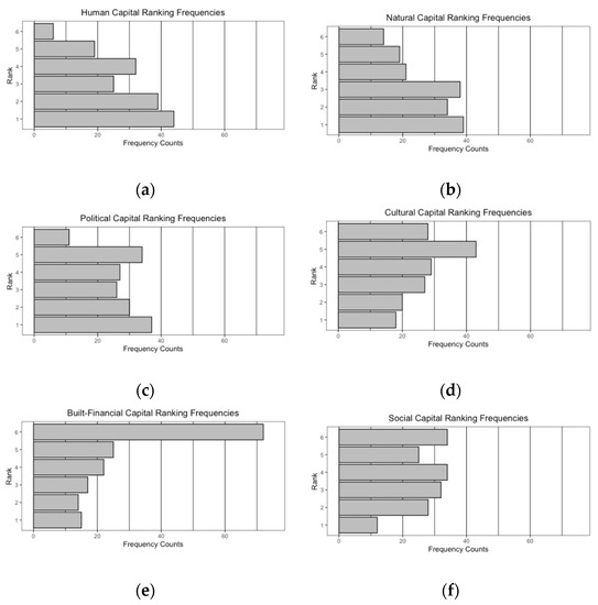 Absolute Frequency Distributions for Community Capital Ranking Data: (a) Human; (b) Natural; (c) Political; (d) Cultural; (e) Built–Financial; (f) Social.