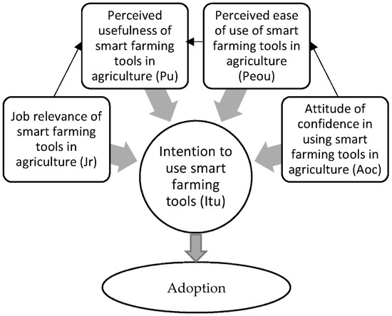 Perceived usefulness of smart farming tools in agriculture (Pu) positively affects the intention to implement PAT.