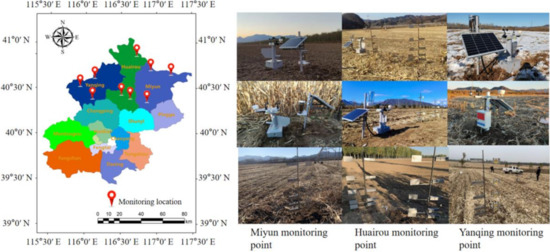 In order to monitor the effects of three types of conservation tillage techniques, including straw burial, stubble + straw mulching, and straw mulching, in suppressing the seasonally exposed farmland dust. As shown in Figure 1, between September 2020 and October 2021, the monitoring team built nine farmland dust monitoring points based on local crop planting and straw treatment characteristics in Miyun, Huairou, and Yanqing.