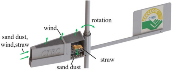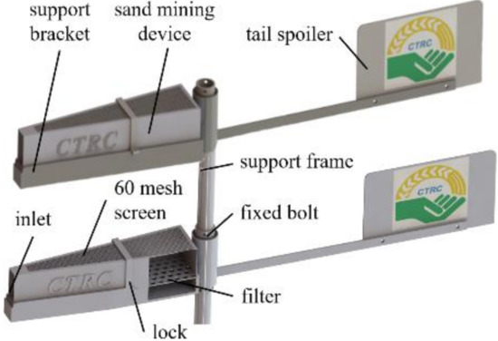 In order to measure the distribution of wind erosion, a dust collector is installed at the monitoring point. The China Institute for Conservation Tillage independently developed the dust collector comprises a sand mining device, tail spoiler, support bracket, fixed bolt, and support frame [22], as shown in Figure 2. Among them, the sand collector is the central part of the dust collector. The tailwind deflector is used to automatically adjust the direction of the air inlet so that the sand outlet can always face the wind direction and ensure the effective collection of farmland dust. The fixed bolts fix the sand mining device at different heights of the support rod. The distances between the sand mining ports of the five sand mining devices of the sand dust collector are 10 cm, 25 cm, 60 cm, 100 cm, and 150 cm from the surface, respectively, and they can collect sand at five heights. As shown in Figure 3, during the working process of the dust collector, the airflow, surface sand, and a small amount of straw enter the air inlet of the sand mining device, and the airflow leaves the sand mining device through the 60-mesh screen. In contrast, sand and straw remain in the mining device. The stratification of sand and straw is completed in the sander and by the internal filter screen. Dust monitors the amount of wind erosion and the particle size distribution of sand and dust at different heights. In order to obtain the change in farmland wind erosion in different periods, the sand and dust samples collected by the sand-dust collector at the monitoring point were regularly sampled. The sand and dust in the sand collector at different heights were collected and bagged, respectively, to calculate the amount of sand carried by a unit area.
