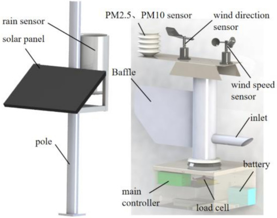 The monitoring team used the farmland dust online monitoring system independently developed by the China Institute for Conservation Tillage to measure the concentration changes of PM2.5 and PM10 near the surface of the farmland [25]. Figure 4 and Figure 5 show that the monitoring system comprises the central controller, PM2.5 and PM10 measurement sensor, wind speed sensor, soil temperature, and humidity sensor, rain gauge, battery, solar panel, and other hardware. A solar panel and battery power the monitoring system. The sensor uploads the collected information to the central controller through the RS485 protocol and then uploads it to the cloud platform through the MQTT communication protocol. Finally, the real-time display of monitoring information is completed at the mobile or PC terminal. The monitoring system can complete the collection of near-surface air quality, wind speed, wind direction, 0~5 cm soil temperature and humidity, rainfall, accumulated dust, and other indicators. The sampling frequency is adjustable, and the maximum sampling frequency is once per minute.