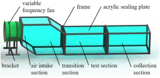 The fan provides the air source for the entire wind tunnel; the transition section is the transition between the circular section of the power section and the rectangular section of the stable section. The airflow is gradually kept uniform and stable in the transition section. The airflow reaches the test section evenly accelerated; the test section is the core of the wind tunnel. The length × width × height is 0.9 m × 0.45 m × 0.45 m, respectively. The bottom of the wind tunnel in the test section is the field surface, and in the test carried out in this section, PM2.5 and PM10 emission measurements are completed at the collection end.