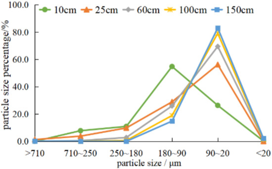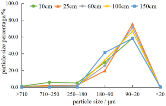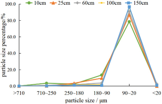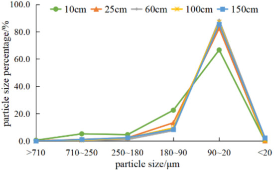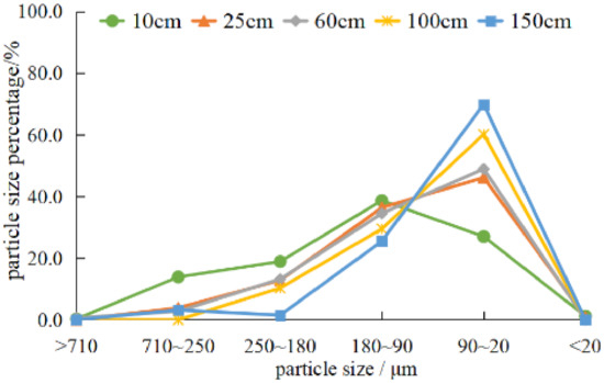 In order to obtain the particle size distribution of sand dust at each height, 25 mesh, 65 mesh, 80 mesh, 180 mesh, and 700 mesh screens were used to screen and classify the collected sand and dust samples. And ≥710 μm, 250~710 μm, 180~250 μm, 90~180 μm, 20~90 μm, and <20 μm obtained. There are six grades in total, and the weight of each grade is weighed separately to obtain the distribution percentage of sand dust particle size of each grade.