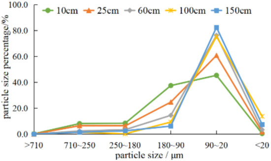 The experimental results of the particle size distribution of fugitive dust in conservation tillage and traditional tillage farmland show that the particle size distribution of dust is different in any mode. The particle size of farmland dust in traditional tillage and conservation tillage modes is mainly concentrated between 20 and 90 μm. With the increase in sampling height, the average diameter of dust particles decreases significantly. The closer the surface, the larger the particle size of fugitive dust collected is. The main reason is that the particles with large particle sizes have high gravity, and the buoyancy generated by airflow is challenging to bring them to high places.