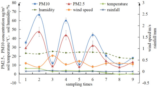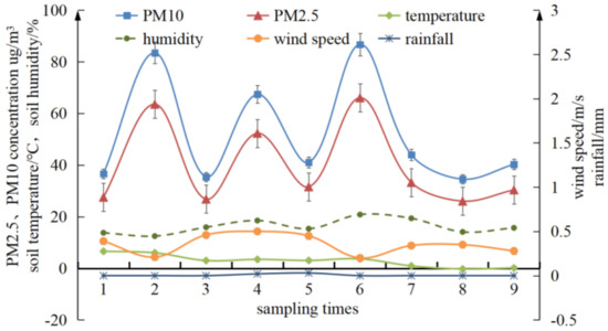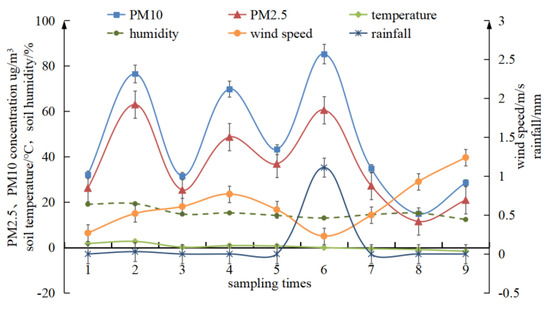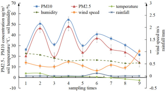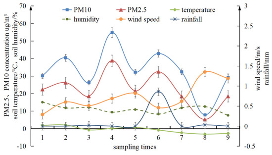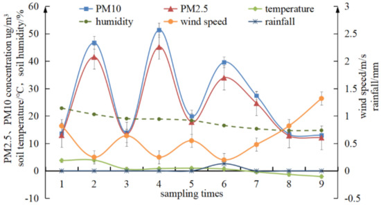 Farmland soil dust is an essential source of PM2.5 and PM10. Wind-eroded fugitive dust on exposed farmland surface soil affects PM2.5 and PM10 concentrations and air quality in the atmosphere through diffusion and other processes [23]. At the same time, factors such as wind speed, surface temperature, humidity, and rainfall will have a specific impact on PM2.5 and PM10 concentrations in the near-surface air of farmland [24].