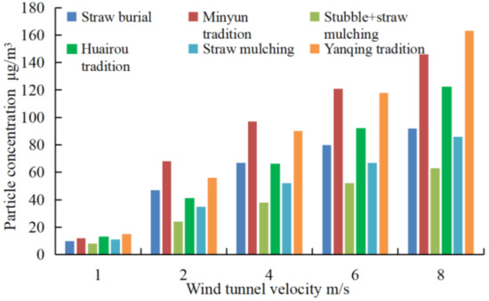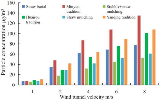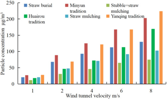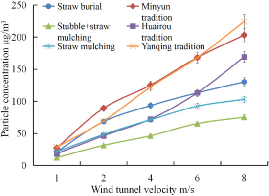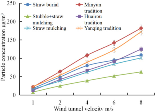 Straw mulching compared with the traditional tillage mode in Yanqing District, the release concentrations of PM2.5 and PM10 at the sampling height of 10 cm decreased by 33.09% and 40.91%, respectively, and the release concentrations of PM2.5 and PM10 at the sampling height of 20 cm decreased by 34.50% and 36.61%, respectively.