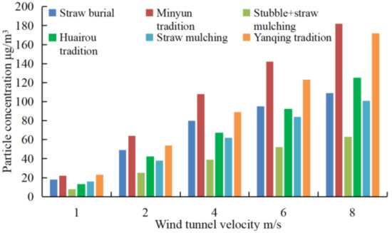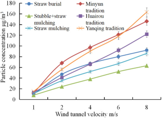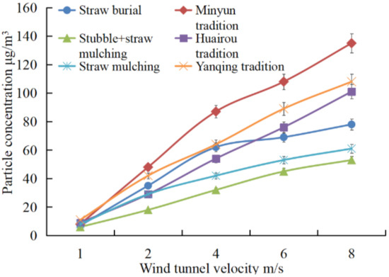 - The wind tunnel test verification shows that when the surface wind speed is in the range of 1~8 m/s, the release concentration inhibition trend of straw burial, stubble + straw mulching, and straw mulching modes PM2.5 and PM10 tends to be consistent with the monitoring results of farmland near-surface PM2.5 and PM10. In the wind tunnel test data, it is found that the released concentrations of PM2.5 and PM10 increase with the increase in wind speed under the modes of straw mixed burial, straw mulching, and stubble + straw mulching.
