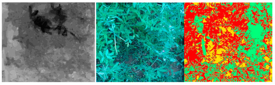 Examples of Lytro photographs. (center) the fully focused image. (left) the depth map. (right) one example of segmentation (the soil is in yellow, Trifolium alexandrinum, is in red, Viscia sativa is in green).