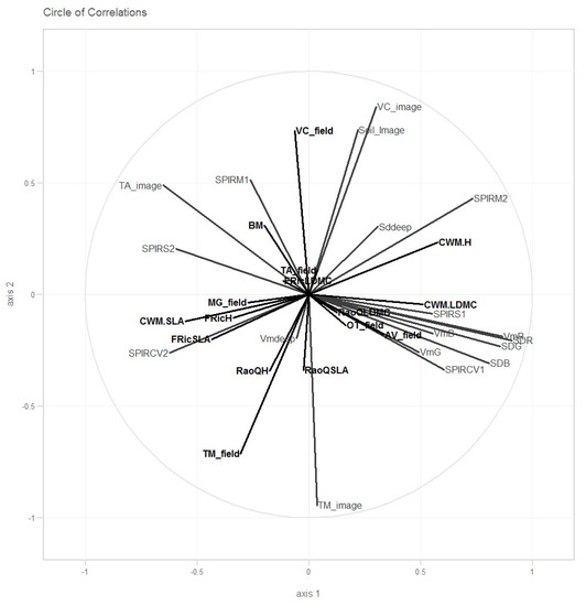 Correlation circle of PLS regression. The vegetation descriptors measured in the field are in black and the variables obtained from the plenoptic image and NIRS are in gray.