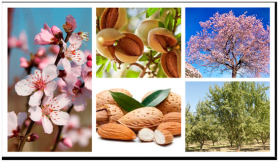 The almond tree (Prunus dulcis (Mill.) D.A. Webb) is a species of tree included in the subgenus Amygdalus [1]. The almond tree is a member of the genus Prunus L. within the family Rosaceae, native to south-central Asia and cultivated in Mediterranean-type climates [2]. In addition to commercially cultivated almonds, there are about 30 species of wild almonds that are generally more bitter than the cultivated varieties [3]. The origin of the almond occurred ~5.88 million years ago [4]. Almond trees were originally planted as genetically diverse orchards represented mainly by bitter seedlings. Subsequently, [5] a genetic mutation controlling the sweetness of the kernel was discovered, allowing the domestication of almond as a food crop. The cultivated sweet almond Prunus dulcis (Figure 1) was likely selected from prehistoric populations by interspecific hybridization for their more desirable taste [6], and recently, redomesticated almond germplasm has been identified to improve nutritional qualities and food safety [7]. Almonds were one of the first domesticated fruit trees. As early as the Early Bronze Age (3000–2000 BC), domesticated almonds appeared in archaeological sites in Numeira (Jordan) [8]. Tutankhamun’s tomb in Egypt (ca. 1325 BC) is another.