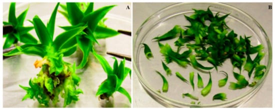 (A) Aseptic ‘MD2’ pineapple in vitro plants (4–6 weeks old) used as a source of explants to induce direct and/or indirect morphogenesis; (B) leaves isolated from the in vitro plants used as initial explant.