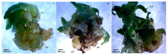 Somatic embryos formed directly from ‘MD2’ hybrid pineapple explants in M3 treatment. (A,B) Direct formation of globular structures (GS) from leaf explants, (ED) advance stage of embryo development. (C) Asynchronous development of formed embryos; FLP: foliar leaf primordia.