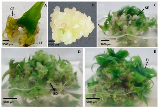 Indirect somatic embryogenesis (ISE) from young leaves of ‘MD2’ pineapple grown in the M7 treatment (2 mg L−1 of 2,4-D and 2 mg L−1 of BAP). (A) Incipient callus formed at the base of the leaf, CF: callus formation; (B) primary callus of vitreous white color, semicompact consistency; (C) embryogenic callus of greenish white color, with embryogenic structures (SE) visible at various stages of development; (D) appearance of globular embryos; ED: advance stage of embryo development; (E) high embryogenic capacity of the induced callus, with embryos multiplying and developing asynchronously; FL: foliar primordia.