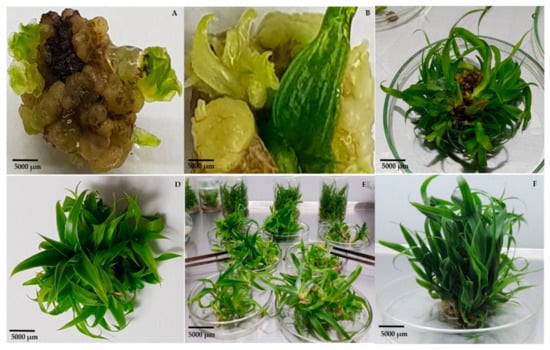 Efficient regeneration of pineapple shoots in the M2 treatment. (A,B) Rapid and abundant proliferation of neoformations with a globular structure; (C,D) proliferation of multiple shoots from neoformations; (E,F) efficient shoot development.