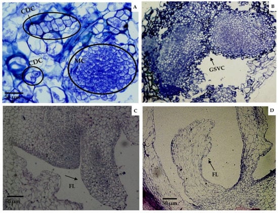 Histological samples that show the intense meristematic activity that occurred in the regeneration with the M7 treatment. (A) Meristematic cells (MC) in active cell division (CDC), vacuolated, isodiametric cells, and prominent nucleus are observed, as well as the successive divisions of the cells to give rise to the formation of the somatic embryo; (B) Globular embryos advanced in their development without vascular connection (GSVC) with the maternal tissue and where the suspensor rupture is appreciated; (C,D) Formation of the first leaf primordia (FL).
