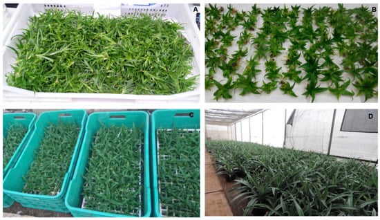 (A,B) Isolation of in vitro plantlets obtained in M3 and M7 media and developed and elongated in M4 medium. (C) Acclimatization in trays with substrate in a greenhouse. (D) Pineapple plants regenerated in vitro and ready to be transferred to the field after 20 weeks in polyethylene bags.