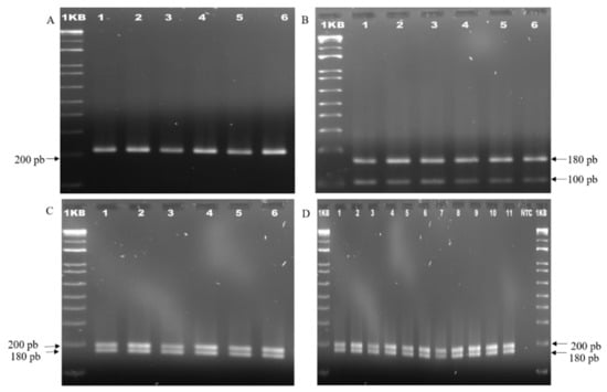 PCR reactions were performed on a Thermal cycler 2720 (Applied Biosystems, CA, USA). The amplification program began with a 2.30 min cycle at 94 °C, followed by 35 cycles at 94 °C at 45 s. The alignment temperatures were 55 °C, 60 °C (45 s), and 72 °C (1 min), with an 8-min final extension cycle at 72 °C. PCR products were separated on 2% agarose gels in a 0.1× TBE buffer (0.04 M Tris hydroxymethyl aminomethane (Tris-HCl); 1 mM ethylenediamine tetra acetic acid (EDTA); 0.04 M boric acid; pH 8) at 100 v (constant voltage). Staining was performed with ethidium bromide and gels were visualized in a U.V. light transilluminator. (BIO-RAD Gel Doc Ez Imager, Hercules, CA, USA). By comparing the size of the amplified fragments to a 1 Kb plus DNA molecular weight marker (Invitrogen, Carslbad, CA, USA), the size of the amplified fragments was determined.