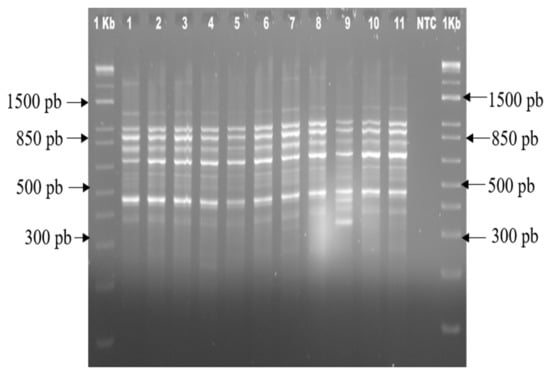 The number of amplified fragments for each primer ranged from 4 to 12 bands, for an average of seven fragments per primer, among all treatments evaluated. The height of the fragments obtained was in the range of 250 to 2000 bp. Figure 8 shows the band profiles obtained with primer IS19, which showed the highest number of bands.