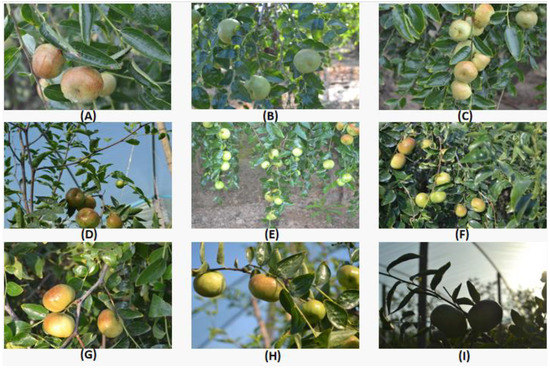 In this study, the flat jujube images were collected between September 4 and October 9, 2021 inside the two flat jujube plantations in Linyi County, Yuncheng City, Shanxi Province, China. The images were captured by the Nikon D-3100 camera (Nikon Corporation, Tokyo, Japan), with a variety of angles selected for image acquisition at the specific time period (8:00 a.m. to 12:00 a.m., 2:00 p.m. to 6:00 p.m.) and shooting distance (30 cm–80 cm). And the row spacing, plant spacing, and plant height were 3.5 m, 2.5 m, and 1.2 m, respectively. The datasets were composed of 9525 RGB (Red Green Blue) images and the resolution was 3456 × 2304 pixels, including the following conditions: different obstruction (leaves, branches, and overlap between jujube), different weather (sunny, cloudy, and rainy), different background (soil, sky, crown, and canopy), different light conditions (sunlight, sidelight, and backlight), etc. Some sample images are shown in Figure 1.
