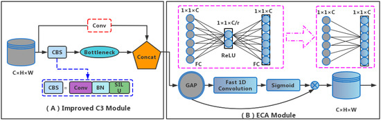 The structure of improved C3 module and ECA (Efficient Channel Attention) module. C, H, and W refer to the channels, height, and width of the input image. Conv means that the convolutional layer (A) The red dotted box indicates that the convolution layer has been removed. The blue dotted box indicates that the convolutional layer (Kernel size: 1 × 1), BN (Batch Normalization) layer, and SiLU (Sigmoid Weighted Liner Unit) activation function together form the CBS (Convolutional layer, Batch Normalization, Sigmoid Weighted Liner Unit) module. (B) GAP indicates that Global Average Pooling. “⊗” indicates that element-wise product. The purple dotted box indicates that the fast 1D convolution to replace FC (Full Connection) layers in channel attention module.