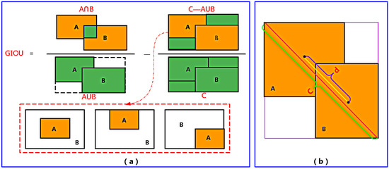 Structure of loss function. (a) GIOU (Generalized Intersection over Union): A and B indicate that the boxes of true and predicted, the red dotted box indicates the special position of A and B, the green area means the required intersection area. (b) C indicates the diagonal distance from the minimum circumscribed rectangle bounding A and B. d indicates that the Euclidean distance between the center points of the boundary box A and B.