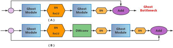 The structure diagram of Ghost Bottleneck. BN means that Batch Normalization layer. Add operation means that the superposition of information. ReLU means that the Rectified Linear Unit. (A) Stride = 1 (B) Stride = 2. DWconv means that the depthwise separable convolution.