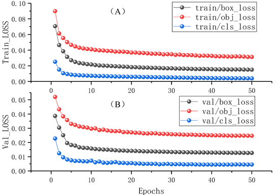 This paper used the strategy of multiple combination of four attention mechanism modules to experiment. The same set of parameters was used for each experiment, and the official pre-trained weights of YOLOv5s was used to transfer learning until the model converged. After 50 epochs in the training process, all curves of LOSS reached a relatively stable state. The curve of LOSS was shown in Figure 5, and the conclusion could be seen from the picture: the curve in the early training dropped rapidly, it had leveled off after the 50 epochs and reached convergence, and it had no phenomenon of under-fitting or over-fitting.