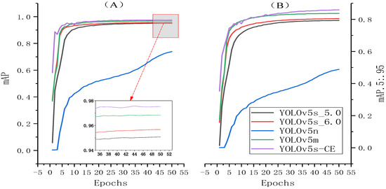 According to the table, the improvement of network performance by multiple mechanisms of attention was generally better than that of neural network performance by a single attention. The improved network converged after 43,350 iterations, and each index increased in different degrees. To screen a model of the highest accuracy by comparing the F1 and the mAP.5,.95: in three schemes where the F1-score reached 0.93 based on a confidence above 0.610, including ECA + 2SE + 4CA, 4CA + 2SE + 2TR and 4CA + 2ECA, and the mAP.5:.95 of 4CA + 2ECA was the highest one at different thresholds. Therefore, this scheme of 4CA + 2ECA which had the best result was named as YOLOv5-CE, and the mAP of this model was compared with different versions under the YOLOv5 network. The results are shown in Figure 6.