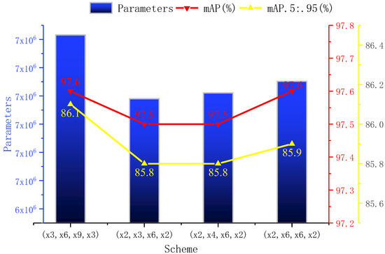As available from the above figure, when the number of C3 modules in layers 2, 4, 6, and 8 of the backbone network is reduced from (×3, ×6, ×9, ×3) to (×2, ×6, ×6, ×2), the accuracy indexes (mAP and mAP.5:.95) remain basically unchanged. Meanwhile, there is a slight decrease in the complexity index, where the parameters decreased by 2.3%, so this scheme had the best effect among three schemes.