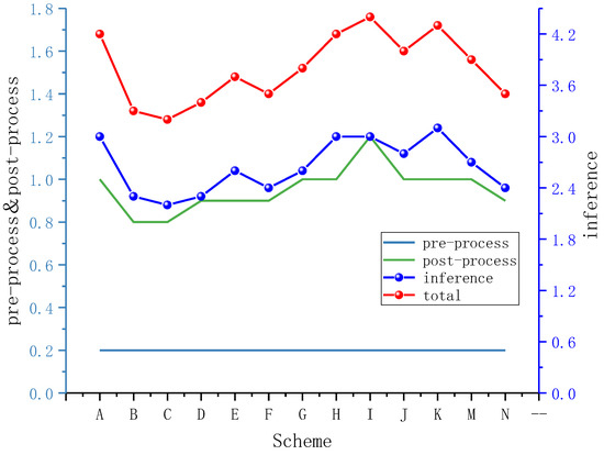 The detection time curves under different schemes. “A–N” represents the different schemes presented in Table 6.
