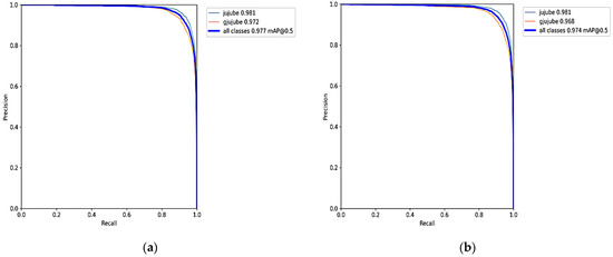 The P-R curves of the improved network and its lightweight network are shown in Figure 9. The mAP of mature fruit is 98.1%, while the mAP of immature fruit decreases from 97.2% to 96.8%. As a result, the mAP of the overall network decreased from 97.7% to 97.4%. This is because the color of the immature fruit is similar to the background containing the leaves and the crown, and thus the ability of the lightweight networks that extract features from small targets in this background was subsequently weakened.