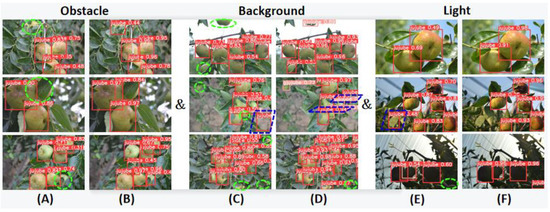 In order to show the recognition effect of the improved algorithm to the field flat jujube, the pictures with different obstacles, different light conditions, and different backgrounds were selected for detection and comparison. The results are shown in Figure 11.