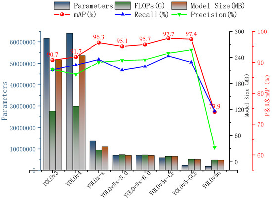 As can be seen from Figure 12, the detection accuracy of the improved algorithm (YOLOv5-CE) is higher than the other seven algorithms. The YOLOv5-GCE network has a more obvious advantage in accuracy and complexity than YOLOv3, YOLOv4, and YOLOx-s. Meanwhile, its parameters and model size decreased to 35.57% and 44.26% of the YOLOv5-CE, respectively, and the model size was compressed to 5.4 MB.