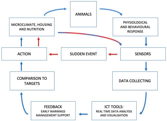Schematic overview of farm management optimisation through the implementation of PLF tools [18,19,20]. The sensors are used both to collect data leading to the optimization of daily decisions in farm management and as an element of a direct response to microclimate changes occurring in the livestock building (marked with red arrows), which, in response to the needs, e.g., automatically controlling ventilation by adjusting the velocity in case of elevated temperature or humidity levels [21].