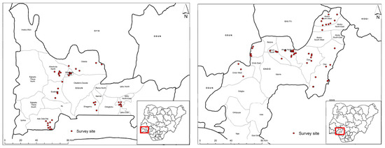 A multistage random sampling was adopted in selecting the youths. The youth selected for this study are between 15–35 years because this is the considered age group of youth in Nigeria [11]. Firstly, we choose purposively two states (Ondo and Ogun) in Southwest Nigeria where YIAP has been conducted in the past. A list of youths (location inclusive) who participated in YIAP was obtained from the agriculture ministry. With the assistance of the officials of the Ministry of Agriculture in both States, we were able to select seven local government areas (LGAs) where YIAP has been conducted. The third stage involves the random selection of five communities in each LGAs. Finally, we selected 5–10 participants and non-participants youth of YIAP, leading to a selection of 668 youth farmers for the study. The sample size was calculated using Cochran’s [22] sample determination procedure, with a 95% confidence range and a 5% margin of error. The sampling procedure yielded a self-weighing representative sample that had the same chance of picking every youth farmer in the study region. The youths in the study area engaged in different agribusiness enterprises such as crop and animal production and agro-processing. The map of the study area is shown in Figure 1.