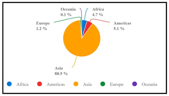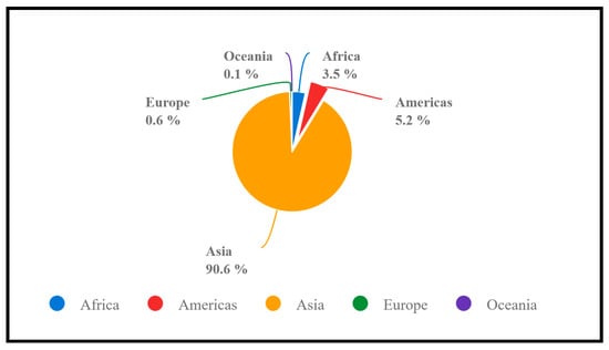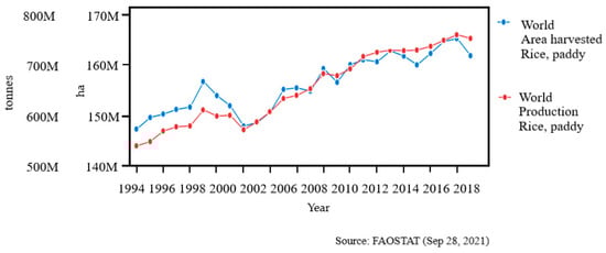 Rice is a crop that provides food for approximately half of the world’s population. Rice is a vital crop globally, accounting for over 21% of human caloric requirements and up to 76% of the calorific intake of Southeast Asian inhabitants []. Figure 1 shows that global paddy rice production increased from 1994 to 2019 []. According to the United States Department of Agriculture (USDA) [], the primary rice production for 2020/2021 is 148.30 million tonnes (Mt) in China, followed by 120.00 Mt in India, 35.30 Mt in Bangladesh, 34.90 Mt in Indonesia, and 27.10 Mt in Vietnam. Furthermore, Thailand produced 18.6 Mt, the Philippines produced 12 Mt, Japan produced 7.62 Mt, Pakistan produced 7.60 Mt, Brazil produced 7.48 Mt, the United States produced 7.23 Mt, Nigeria produced 5.04 Mt, the European Union produced 1.96 Mt, Malaysia produced 1.83 Mt, and Turkey produced 0.59 Mt. Figure 2 illustrates rice and paddy production (average 1994–2019). Asia produces 90.6% of the global rice production, making it the world’s largest producer [,].