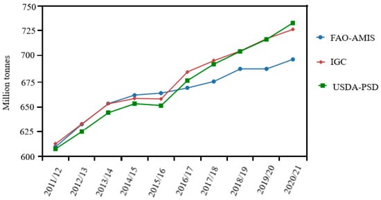 Rice consumption per capita is steadily declining in several Asian countries, due to changing dietary habits brought about by the influence of the Western diet, such as increased consumption of meat, dairy, and fast foods []. The rice consumption in China is 149,000 thousand metric tonnes (TMT), followed by India, Bangladesh, Indonesia, Vietnam, the Philippines, Thailand, Burma, Japan, and Brazil, which consume 106,500, 35,900, 35,800, 21,250, 14,400, 12,500, 10,400, 8250, and 7350 TMT of rice, respectively []. Even though rice production is declining, the current population projections show that Asia will need an extra 8 Mt of rice per year []. Due to the increasing number of Asian communities living in Western countries, the demand for rice in Western world has increased, as has the awareness and appreciation of the people for rice-based dishes []. Therefore, future rice production will need to significantly improve resource efficiency to meet notably increasing demand and discerning consumer demands. Figure 3 depicts the world’s total rice utilisation from 2011 to 2021.