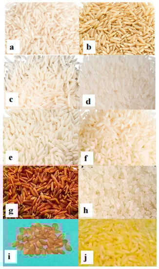 The various varieties of rice: (a) white rice, (b) brown rice, (c) basmati, (d) fragrant rice (e) glutinous rice, (f) ponni rice (g), red rice, (h), japonica rice, (i) weedy or red rice, and (j) golden rice [,].