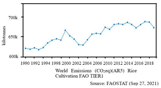 Table 2 shows the FAOSTAT data regarding rice production worldwide in 2019 []. In 2020/2021, the world’s rice consumption was 697.09 Mt. However, only 513.7 Mt (milled rice) was the world’s rice production for that year []. Although food consumption is expected to increase, food consumption growth is expected to account for the largest share of this annual increase, maintaining world per capita rice consumption at approximately 54 kg/person [].