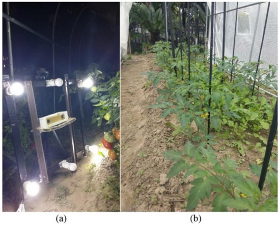 Tomato plants were planted in a greenhouse, as shown in Figure 1b. The brightness varied in different parts of tomato plants under active lighting conditions at night, and lighting spot regions and dark regions appeared on the surface of stems. Tomato plant images were captured at night by using two illumination systems: two 2 W LEDs in up and down layout and two 15 W incandescent lamps in opposite layout. This process was performed to test the performance of the algorithm in adapting to various brightnesses. The shooting distances were 300, 450, and 600 mm.