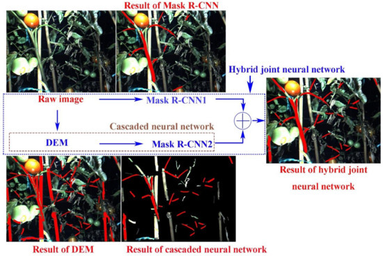 The main purpose of this research was to design a recognition algorithm based on a hybrid joint neural network for stems of tomato plants with similar colours to leaves in colour images captured at night. The hybrid joint neural network is a class of neural network formed by the cascading and parallel connection of several networks. Other objectives were to design a recognition algorithm for stems on the basis of duality relation in edge pairs, train a recognition model based on mask region-based convolutional neural network (Mask R-CNN), and design a cascaded neural network composed of the duality edge method (DEM) and Mask R-CNN.