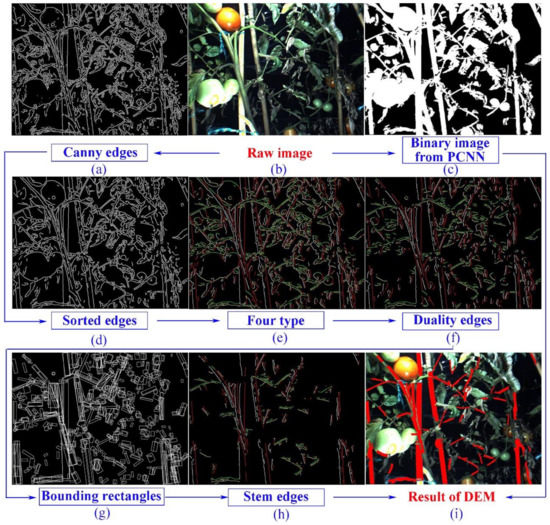 Flowchart of the method based on duality relation in edge pairs (DEM): (a) raw image; (b) binary image; (c) Canny edges; (d) sorted edges; (e) four type edges; (f) duality edges; (g) bounding rectangles; (h) stem edges; (i) result of the DEM. Red captions refer to the input and output images, and blue captions refer to images in process.
