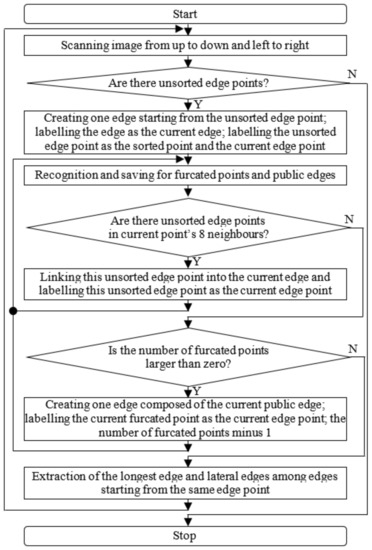 Edges intersect with each other, and the connection status of edges is complex because stems and leaves occlude each other. Thus, the method cannot meet the sorting required by these complex edges using traditional simple sorting algorithms that sort edge points in neighbour orders, such as 4 neighbourhood sorting or 8 neighbourhood sorting. In this study, we designed a new edge sorting algorithm applied to complex edges with fork points that can extract the longest sorted edge. Forked edges are extremely common in tomato plant edge images. The aim of seeking forked points is to extract the longest edge contained in each separated tomato plant region, thereby removing noise in the process. The flowchart of this edge sorting algorithm is illustrated in Figure 4. Details about the edge sorting algorithm can be found in Appendix A. Figure 3d illustrates the sorted results for edges in Figure 3a.