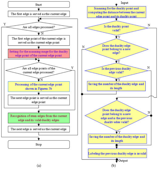 Flowchart of stem duality edge extraction algorithm: (a) main flowchart; (b) sub-flowchart, processing of the current edge point. Color steps refer to core steps.