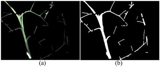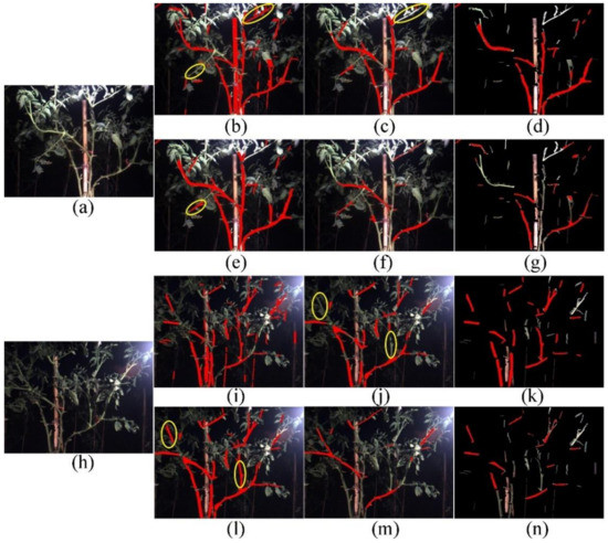 The use of robots is the primary means for achieving automated production of fruits and vegetables and solving manufacturing problems such as labour shortages and high labour costs. Agricultural robots working at night have been investigated in recent years to prolong operation time and improve operation efficiency [1,2]. Vision systems are important in robots, where their main aim is to achieve the recognition and localisation of plant organs. In particular, the recognition of plant stems or branches of trees is of great importance and has high application value in multiple tasks, such as in automatic targeted fertilisation and spraying [3], deleafing [4,5], branch pruning [6,7,8], clustered fruit harvesting [9,10,11,12], harvesting with trunk shaker [13,14], obstacle avoidance [15,16], and navigation [17,18,19].