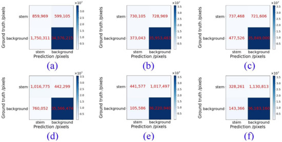 The difference between the pixel-level metrics and the object-level metrics was the unit of calculation. The former was used to compute the TP, FP, and FN in pixels. The latter was computed on the basis of objects. Object-level metrics suggest that the model has the same performance in identifying a large-area stem as it does in identifying a small-area stem. In this study, the model performed better at identifying a large-area stem than at identifying a small-area stem. Therefore, pixel-level metrics were used to evaluate the model performance more accurately.