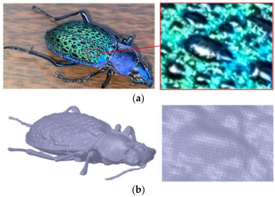 Geometric model of Carabus formosus nili and back convex hull: (a) real model and partial enlargement; (b) 3D reconstruction model and partial enlargement.