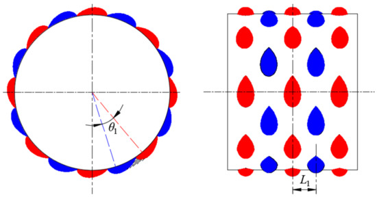 After determining the number of convex hulls arranged on the radial base plane, it is necessary to determine the dislocation angle of the axial adjacent base planes. Taking 45° as a reference, the reference is divided into n1 equal parts, and the dislocation angle θ1 is 45°/n1. The shaded part in the partially enlarged section shown in Figure 5 is related to the operation stability of the non-smooth pressing roll. The smaller n1 is, the larger the shadow part is, the more obvious the vibration of the press roller is, and vice versa. The reference is divided into two equal parts, and the dislocation angle is 22.5°. As shown in Figure 5, the non-smooth press roller is stable in operation and has a certain force reduction capability.