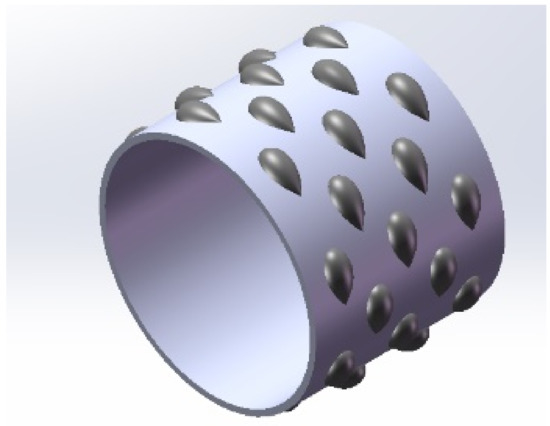 The smooth surface model was reconstructed in 3D by SolidWorks2018 software(SolidWorks, Waltham, MA), and the convex hull geometric surface was extracted. Then, with the design principle that the farthest normal phase distance of the convex package from the surface of the press roller was 16 mm and the proportional method in bionic design, the geometric convex package structure of the convex package on the back of Carabus formosus nili was designed, corresponding to the 3D model, as shown in Figure 2.