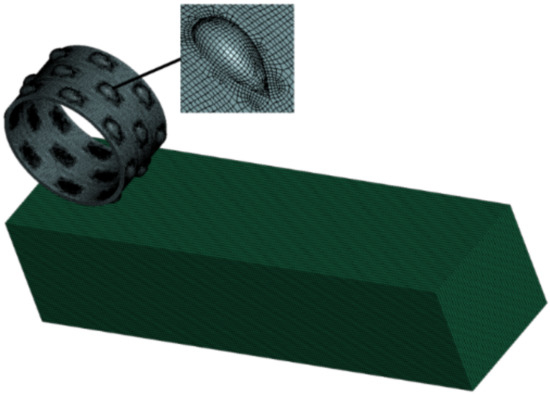 The center base plane of the press roller and the adjacent base planes on both sides were selected as the simulation geometric prototype in Figure 7. The axial spacing was 40 mm. The structural model was fully hexahedrally meshed using HyperMesh 2020 software(Atair Engineering, Troy, Michigan, USA), as shown in Figure 7. The aspect radio was less than 5, and the Jacobian was more than 0.7 and less than 1. The MAT20 material model was selected as the press roller material. The elastic modulus, Poisson’s ratio, and density were 2.1 × 105 MPa, 0.3, and 7800 kg/m3, respectively.